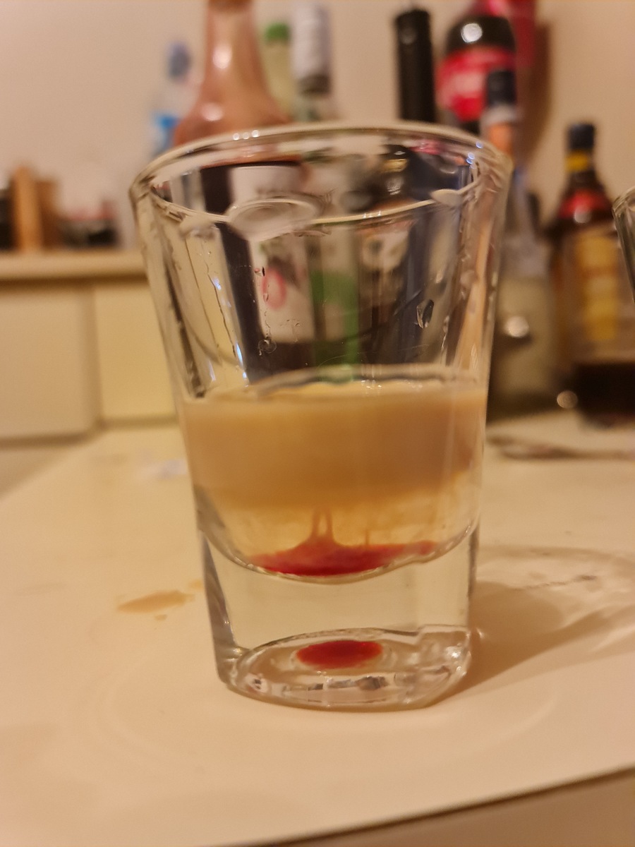 Гренадин вообще почти не почувствовал. В принципе, с самбукой он не плохо сочетается, но не может её перебить (что странно, обычно гренадин перебивает вообще все остальные вкусы, видимо сказывается небольшое количество). В целом по вкусу как айриш крим + самбука. Но послевкусие аниса остается не так долго, как если чистую самбуку пить. В принципе не плохой способ употребления самбуки, довольно вкусно получается.