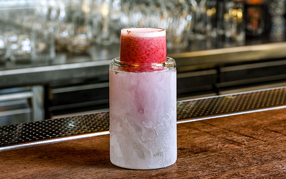 Этот крепкий цветочный сауэр радует не только ставшей уже почти канонической комбинацией джина и ликера из цветков бузины, но и внешним видом. Всего несколько капель яркого фруктового пюре, и настроение сразу поднимается.