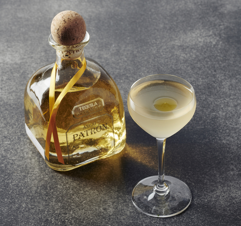 Состав: текила Patron Anejo (40 мл), настоянный на манго вермут (25 мл), манговый ликер (10 мл), биттер Martini (3 дэш), оливковое масло.