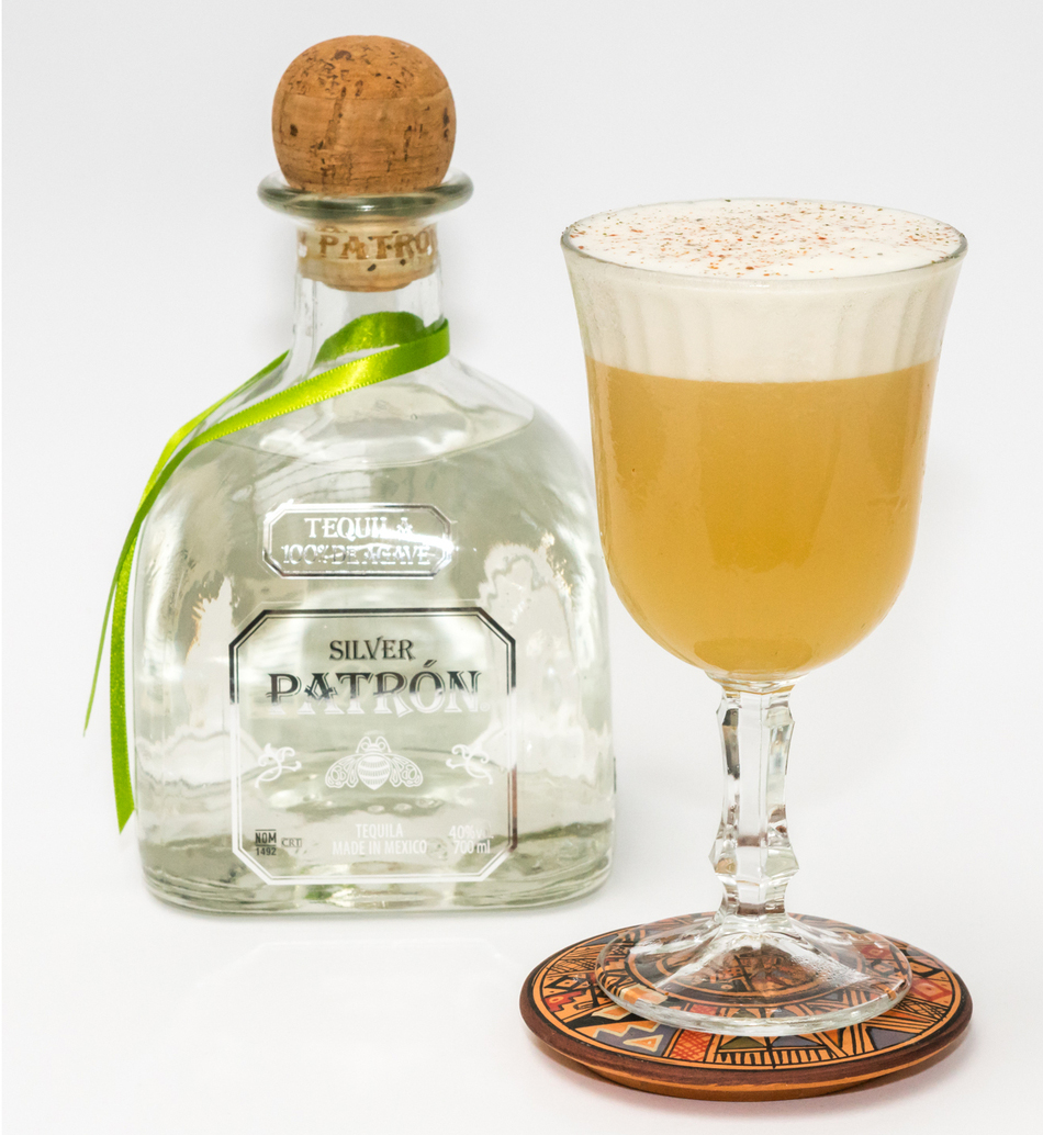 Состав: текила Patron Anejo (45 мл), ликер с перцем чили (15 мл), кукурузное пюре (30 мл), ананасовый сок (15 мл), какао биттер (6 капель), сок лайма (7,5 мл), аквафаба (15 мл).