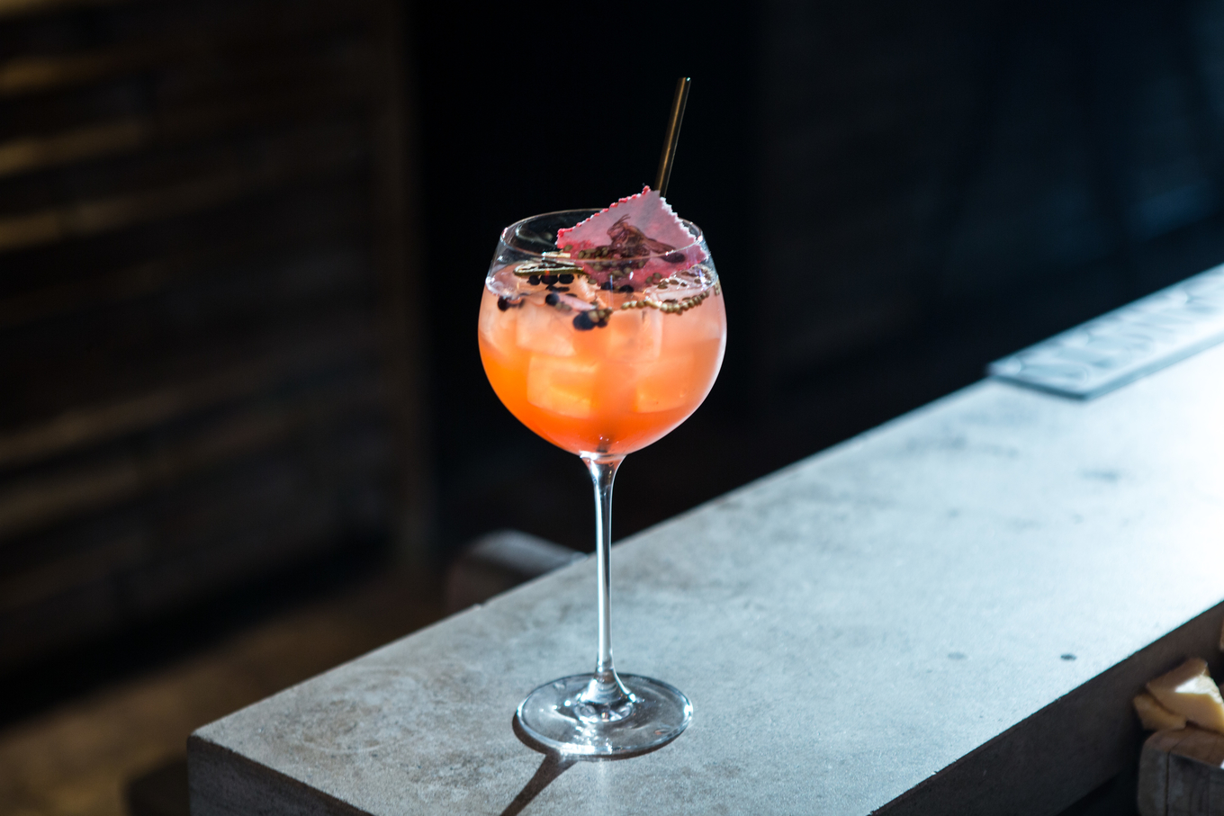Состав: текила Patron Silver (50 мл), сироп ревеня (50 мл), крепленое вино (30 мл), томатная вода (30 мл), соль (1 щепотка).