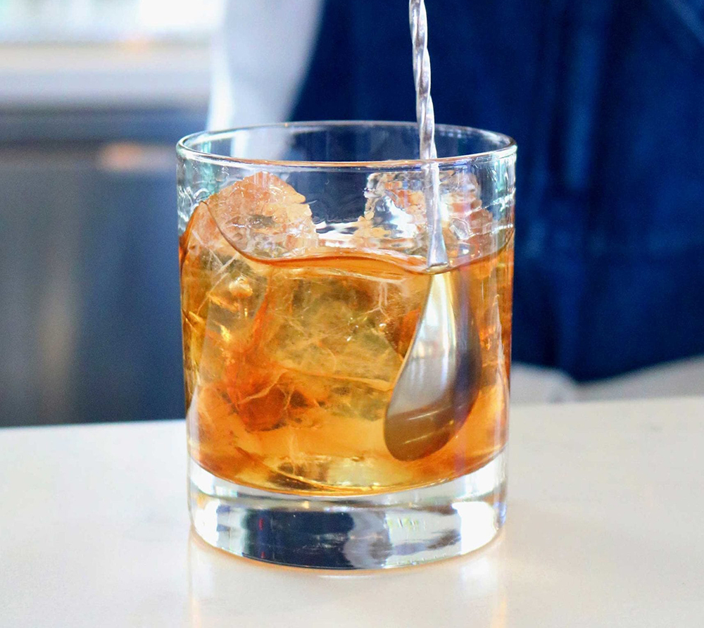 Все ингредиенты нужно смешать в стакане со льдом, перемешать барной ложкой, а затем процедить в рокс с большим кубиком льда и украсить апельсиновой цедрой.