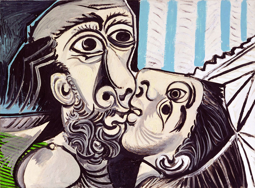 А что было в конце? В поздний период картины Пикассо стали более понятными и менее эстетскими. Вот здесь, например, он изобразил то, что бывает, когда выходя из бара выпивший мужчина спрашивает свою спутницу: «Поцелуемся?»