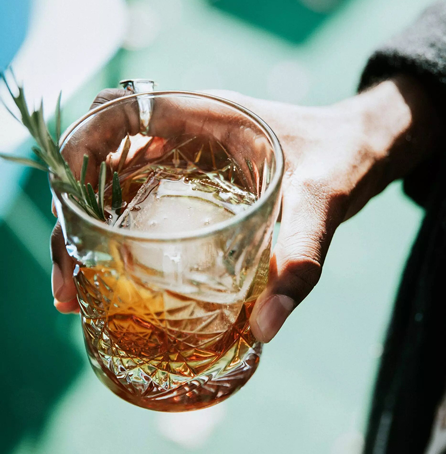 Все ингредиенты нужно смешать в стакане со льдом, а затем — процедить в рокс с большим кубиком льда и украсить цедрой апельсина с веточкой розмарина.