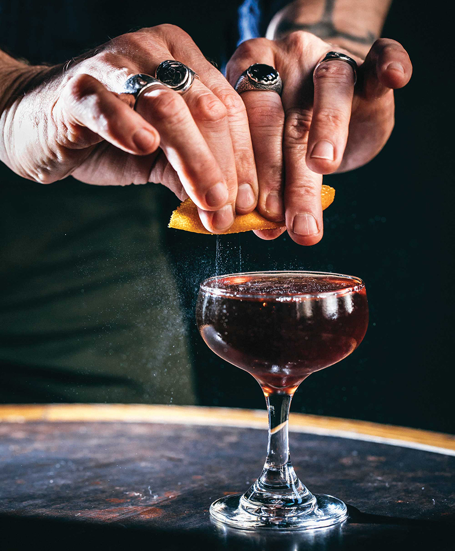 Все ингредиенты нужно смешать в стакане со льдом, а затем процедить в охлажденный бокал купе и украсить апельсиновой цедрой.