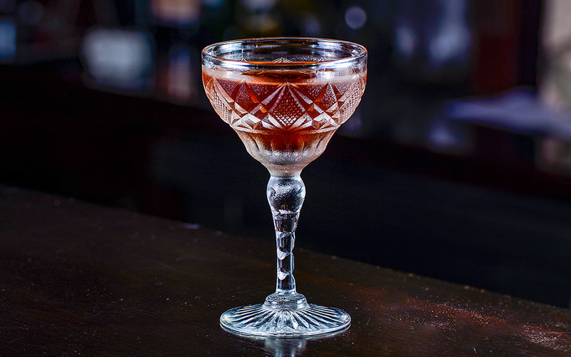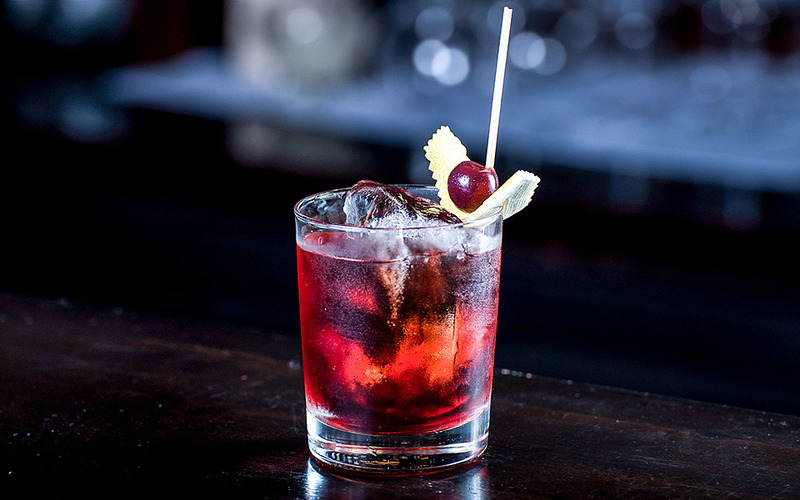 Твист на классический коктейль с домашним джином на гибискусе и пряностях и ликером мараскино.