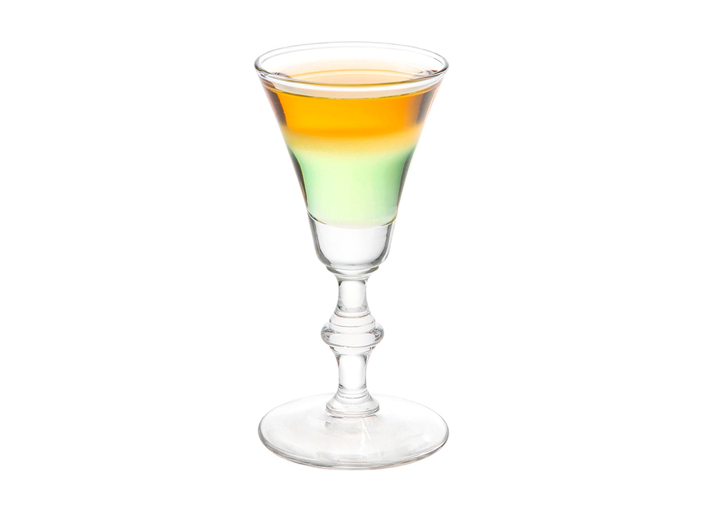 Виски сауэр в виде красивого шота с яблочным ликером и лимонным соком. Ингредиенты укладываются слоями при помощи барной ложки.