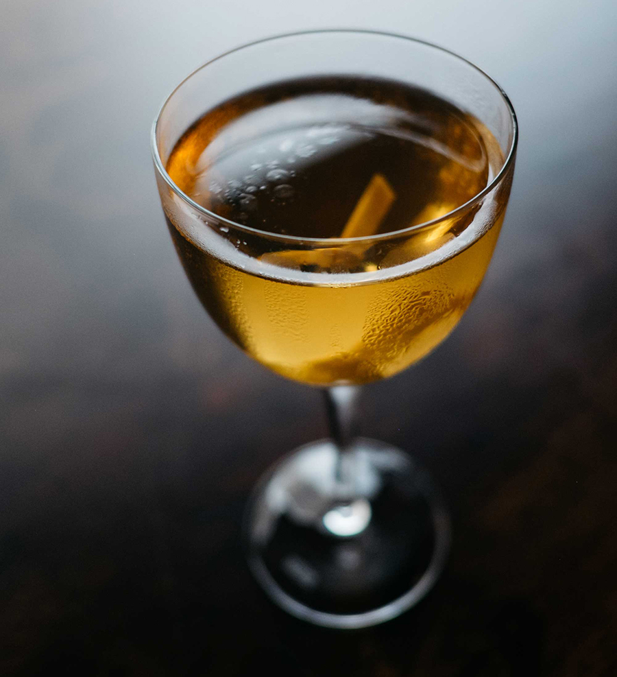 Все ингредиенты нужно объединить в стакане и перемешать барной ложкой, а затем — процедить в бокал и украсить лимонной цедрой, предварительно отжав из нее масло.