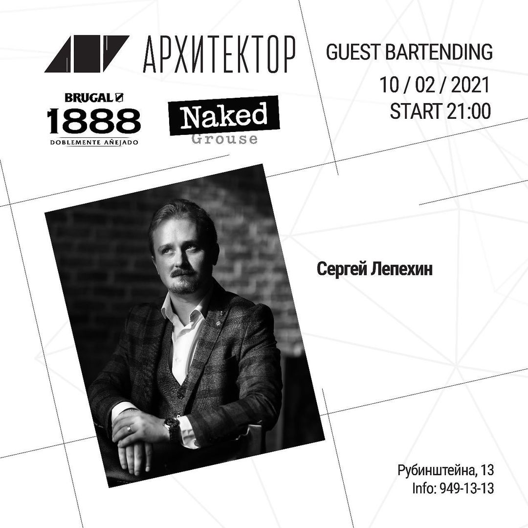 Бренд-амбассадор рома Brugal 1888 и виски Naked Grouse Сергей Лепехин встанет за стойку питерского бара «Архитектор», чтобы радовать гостей авторскими коктейлями.
