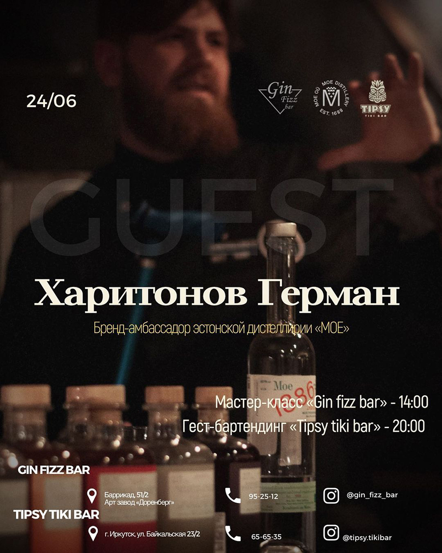 За стойку Tipsy Tiki Bar встанет бренд-амбассадор эстонской дистиллерии MOE Герман Харитонов. А перед этим он проведет интересный мастер-класс в еще одном иркутском заведении — Gin Fizz Bar.