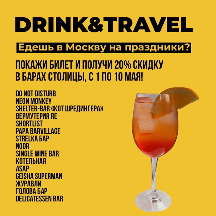 Топовые московские бары запускают специальную акцию для туристов Drink&Travel. Гостям заведений нужно будет показать на стойке билет до Москвы на самолет, поезд или автобус, купленный в период с 1 по 11 мая, чтобы получить скидку 20% на все меню в следующих барах: