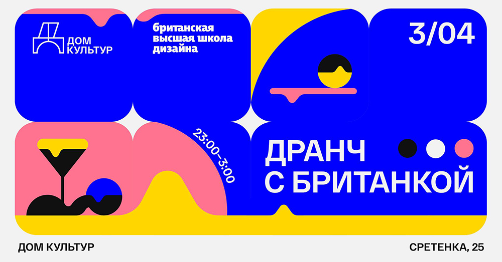 За стойку «Дома Культур» встанут преподаватели «Британской Высшей Школы Дизайна», которой в этом году исполняется 18 лет. Гостей ждут коктейли из-под руки дизайнеров и эксклюзивные новости о будущих проектах «Британки».
