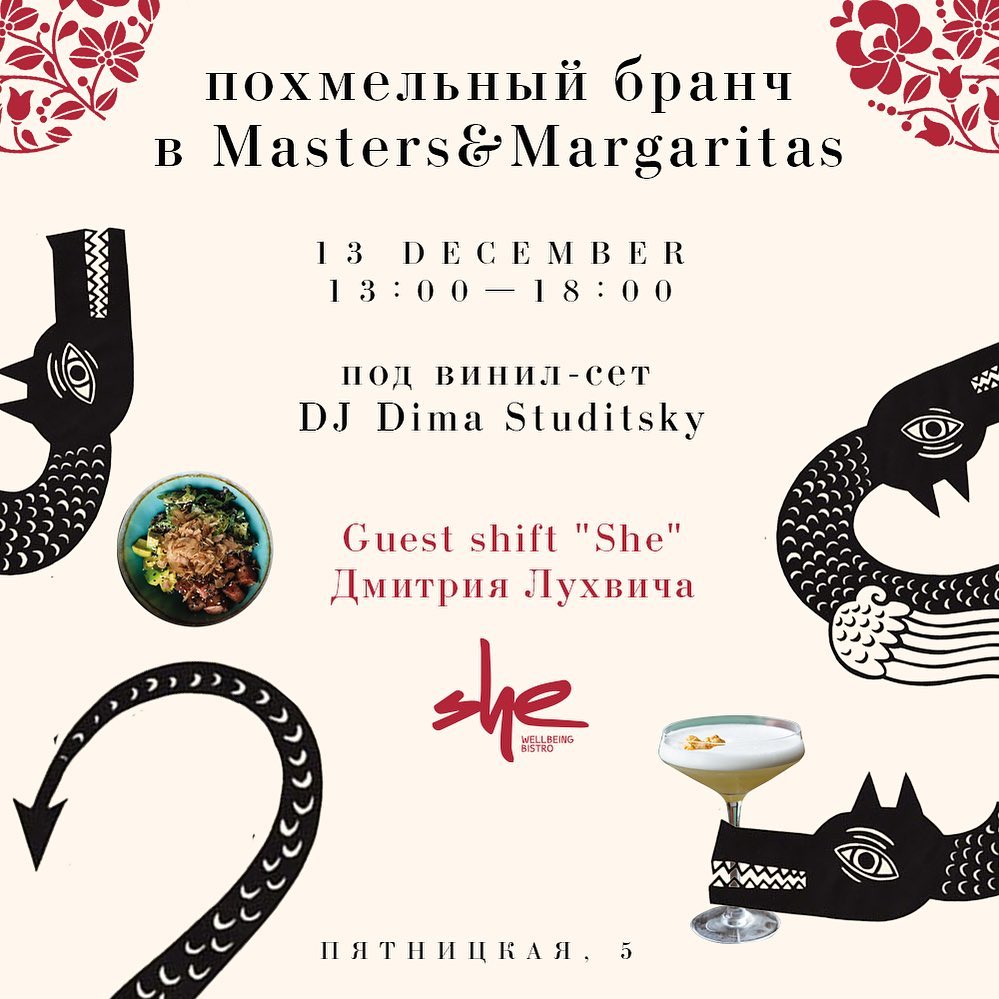 Masters&Margaritas продолжает серию традиционных похмельных бранчей. На этот раз гостем заведения станет старший бармен проекта «She» Дмитрий Лухвич, который под диджей-сет приготовит для гостей несколько авторских коктейлей.