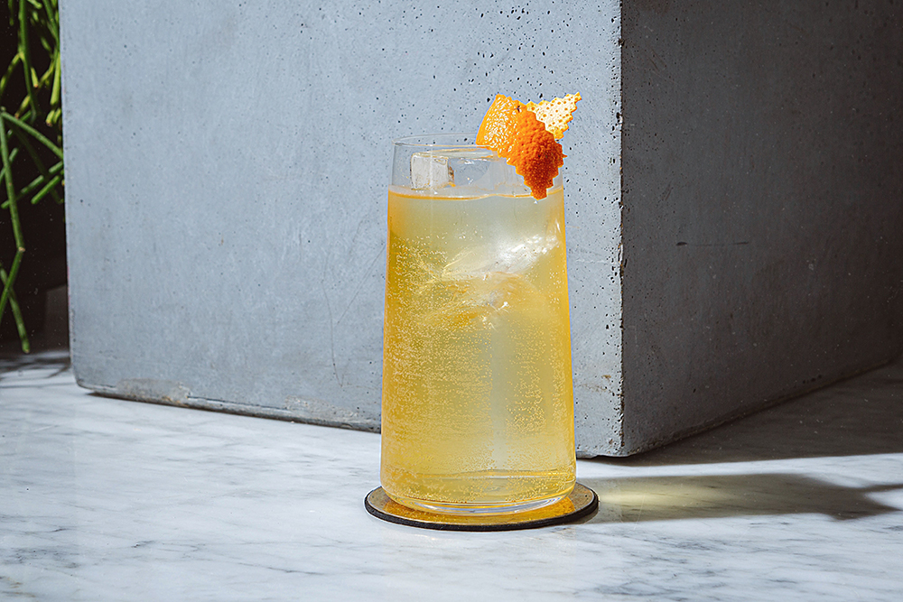Джин, настоянный на листьях нори, апельсиновые ликер и биттер, кордиал.