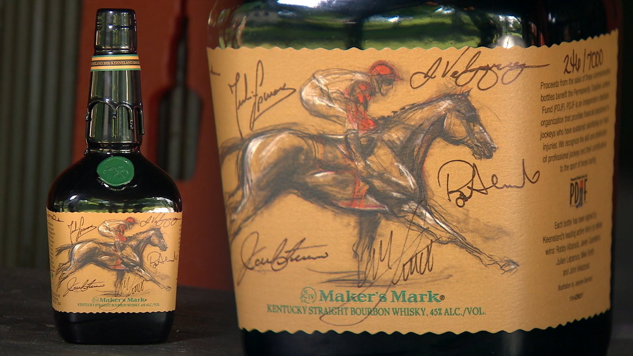 Бутылка бурбона Maker’s Mark Keeneland Limited Edition Autographed Bottle оформлена в черном и зеленом цветах вместо привычного красного, украшена печатью ассоциации Keeneland и этикеткой с изображением жокея на лошади. На этикетке также оставили свои автографы пять звездных жокеев Кентукки.