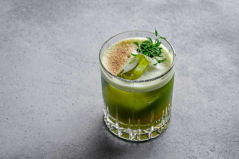 Микс из водки, настоянной на белых грибах, сиропа из кинзы, сока лайма и яичного белка.
