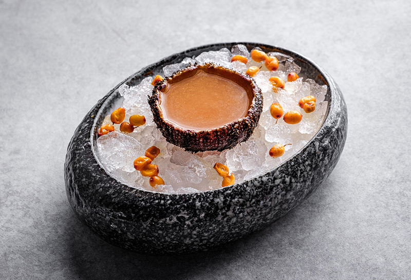 Мескаль, водка, сахарный сироп и облепиха смешаны с икрой морского ежа.