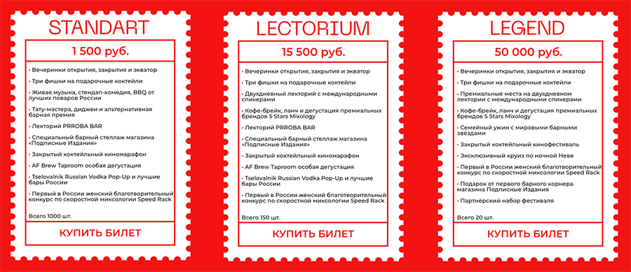 Билеты поделены на три категории: Standart, Lectorium с доступом к образовательной части и Legend с полным доступом ко всем активностям и бонусами. Приобрести билеты всех категорий можно на сайте Saint Petersburg Cocktail Week 2021.