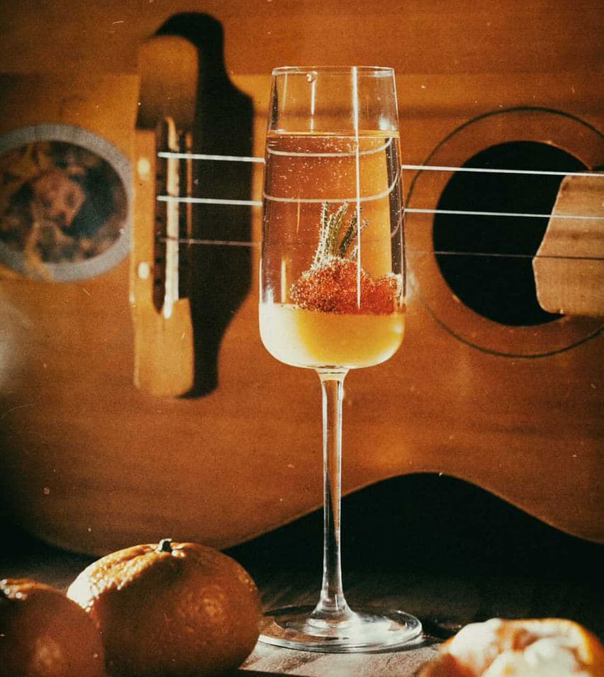 Пряная водка, игристое вино, апельсиновое желе, цитрусовый кордиал, биттер, мармеладная рыбка