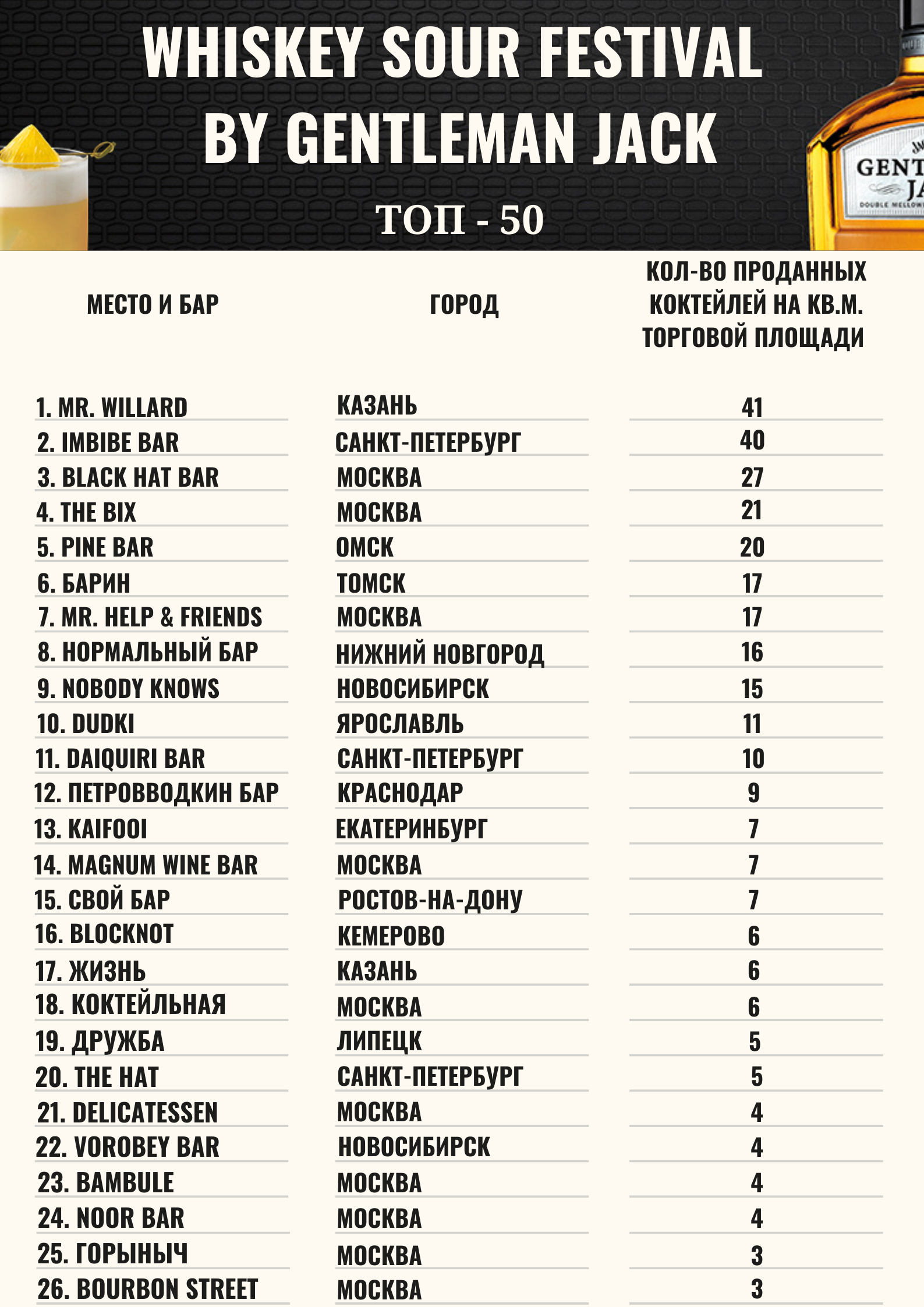 Первый в истории фестиваль Виски сауэров официально завершен, и мы готовы объявить победителей, которые разделят между собой внушительный призовой фонд 1 650 000 рублей. Ими стали бары, продавшие больше всего Виски сауэров на квадратный метр площади. Поздравляем и желаем удачи в следующих миссиях!