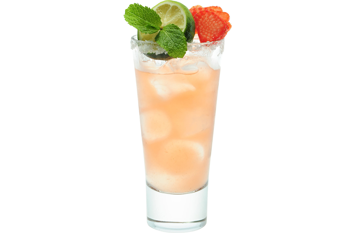 Домашняя клубничная текила, сок грейпфрута, сок лайма, содовая, лайм, клубника, мята, соль.