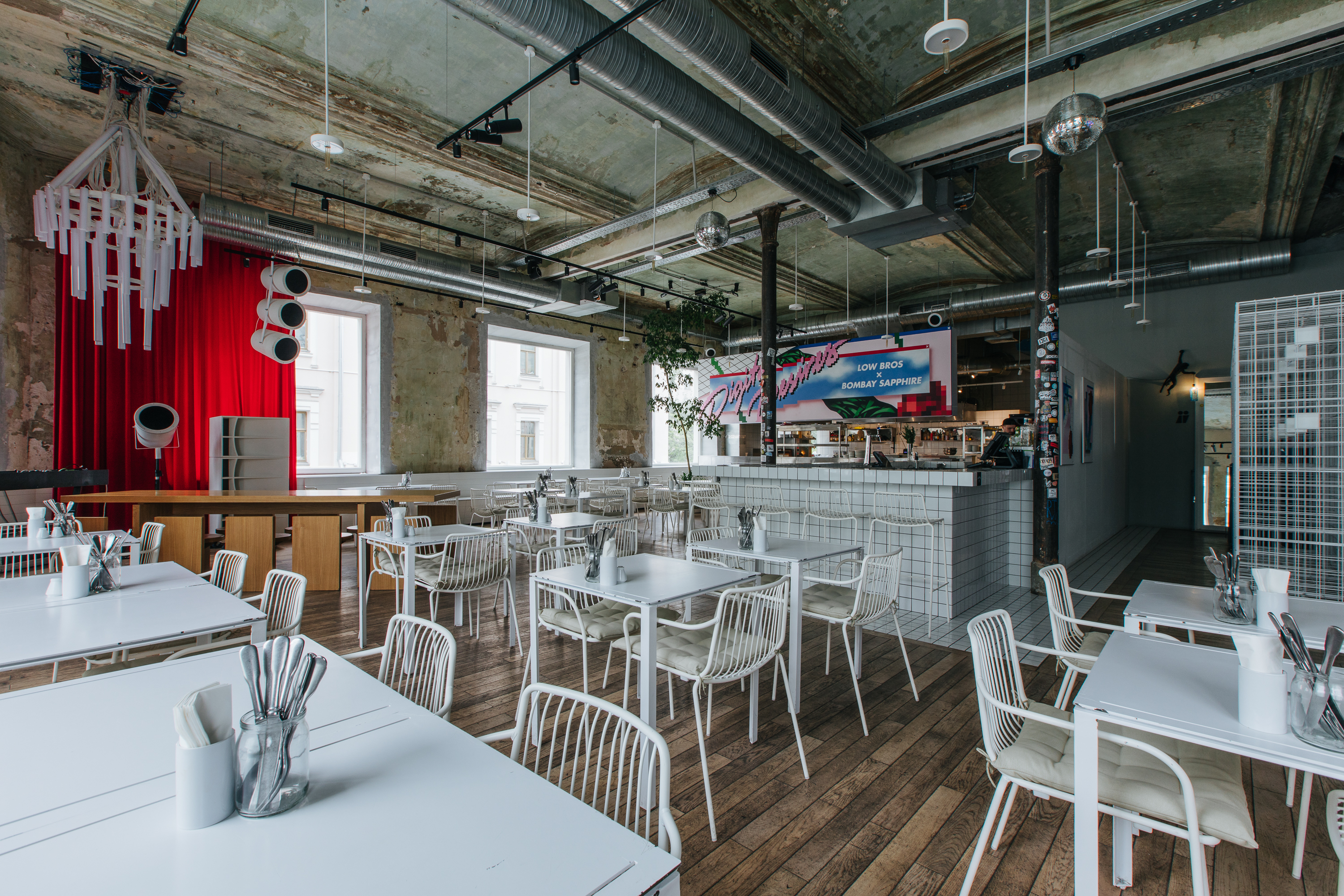 Концепция: «Сначала здесь был обычный бар, и постепенно он начинал обрастать все большим количество задумок. Сегодня это уже мультиформатная история: от йоги по утрам до ночных вечеринок. Первый этаж — кафе-бар «Лобби». Его основная идея — место встреч, как и в любом отеле. Второй — ресторан Comfort-Food c понятной и простой едой для жителей мегаполиса: именно здесь по утрам мы раздвигаем столы и проводим занятия йогой. А на третьем этаже — скрытый бар. Все идеи объединяет общая стилистическая направленность, ключевая задача которого: раскрыть архитектурную данность помещения»