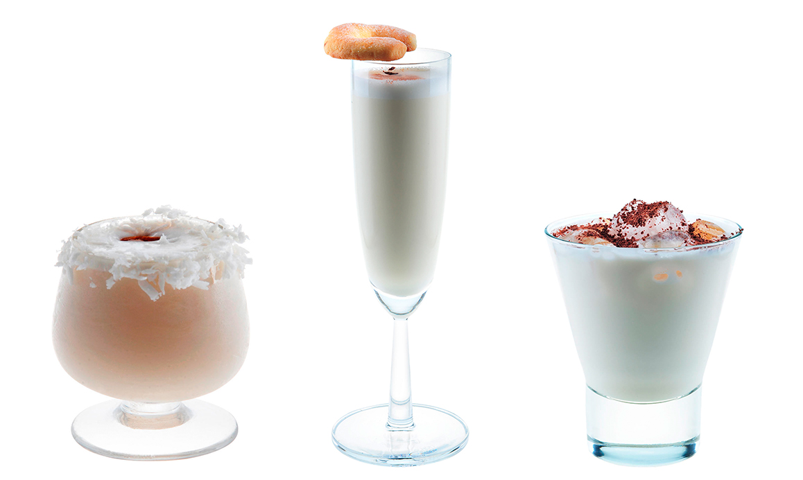 В меню вечера включим три коктейля-десерта на разных алкогольных основах: Рафаэлло на ирландском сливочном ликере, Ром мороженое на темном роме и Дымный флип на шотландском виски.