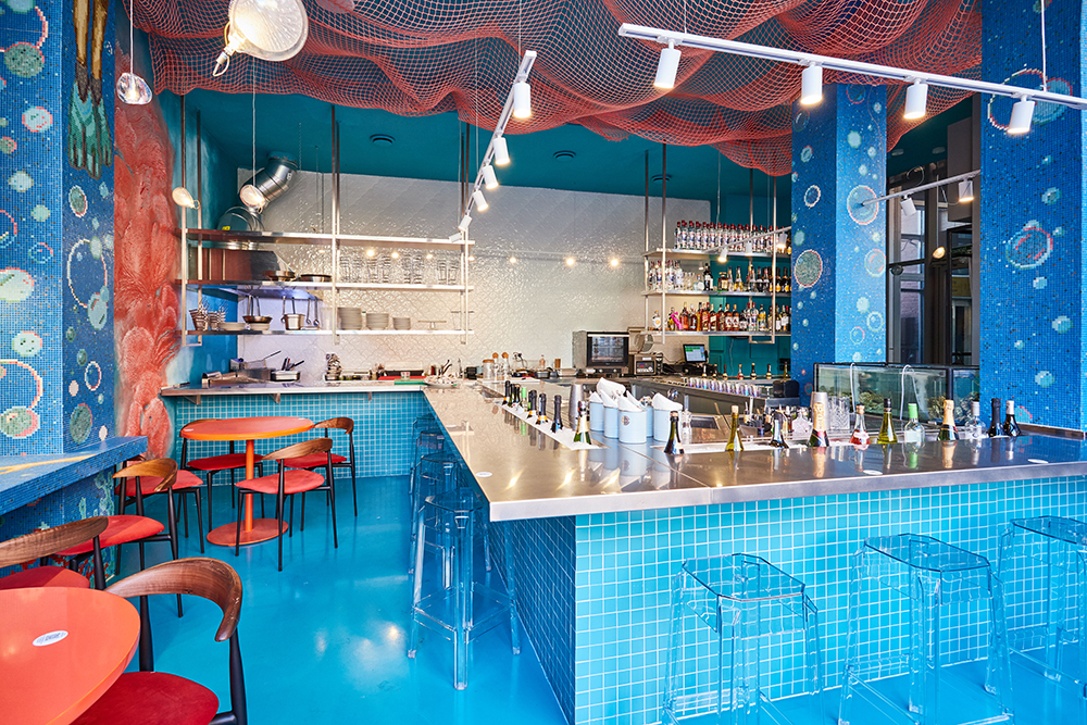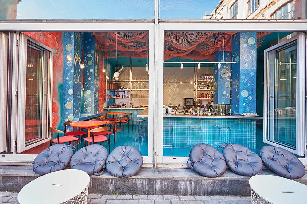 В начале июня в Москве свои двери открыл бар La Vie Aquatique («Водная жизнь»). Его интерьер выполнен в морской стилистике: стены и колонны облицованы мозаикой с изображением русалок и плиткой в виде ракушек, в оформлении преобладают голубые и коралловые цвета, под потолком расположена неоновая сетка. А весь персонал одет в специальные пижамы и красные шапки-бини.
