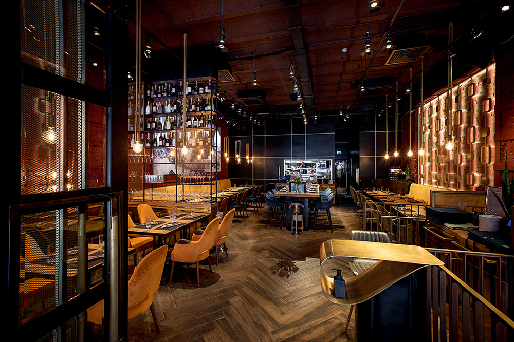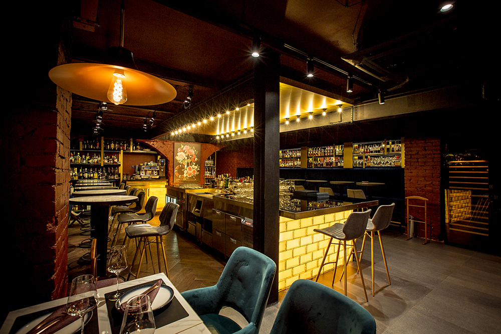Заведение поделено на два уровня. Главный зал — это ресторан, оформленный в сочетании «голого» кирпича и дерева разных оттенков. А внизу, на цокольном этаже, расположена барная зона. Ее главная достопримечательность — открытая со всех сторон стойка, расположенная в самом центре зала: благодаря ей полностью стирается граница между гостями и барменами.
