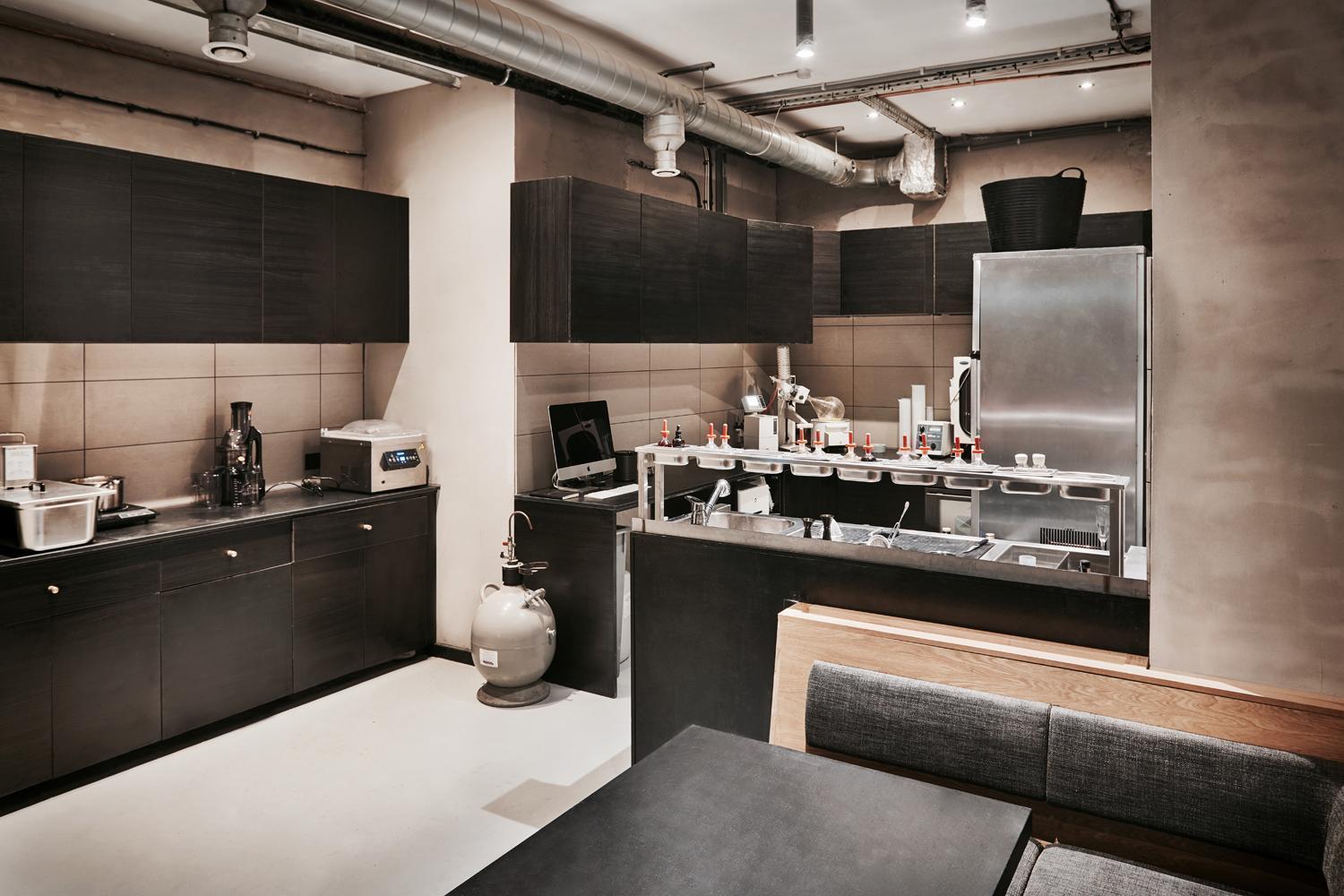 Интерьер бара выполнен в минималистичном скандинавском стиле а-ля IKEA. Внутри гостей ждет обилие дерева, голые однотонные стены в штукатурке, а также декор в виде живых растений и флорариумов. В зале размещена не только барная стойка, но и кухня с коктейльной лабораторией — она открытая и никак не отделена от общего пространства.