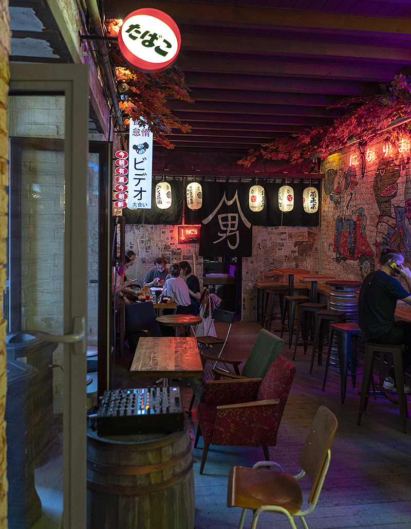Внутренний зал бара, оформленный в стиле лофт с голыми кирпичными стенами и обилием деревянной мебели, украшен привезенными из Японии деталями интерьера, а также неоновыми вывесками и настенными рисунками.