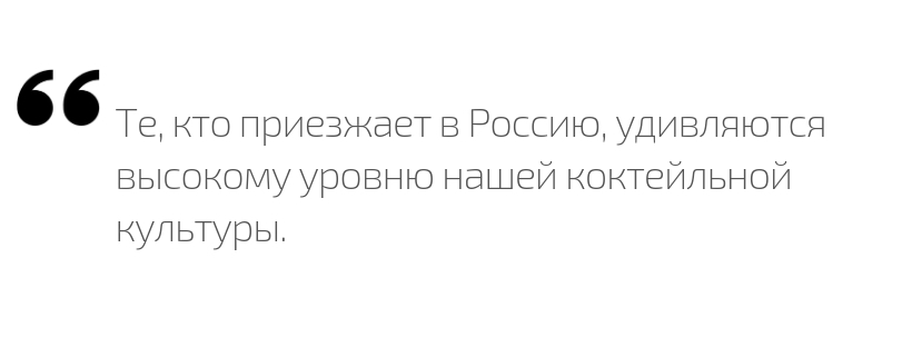 У России всегда был свой, уникальный путь, это касается и нашего ремесла. Мы впитали в себя и европейский, и азиатский стили, сформировав что-то свое. Сейчас мы создаем собственную культуру пития, начинаем верить в себя, и убежден, что в скором времени станем трендсеттерами. Те, кто приезжает в Россию, удивляются высокому уровню нашей коктейльной культуры.