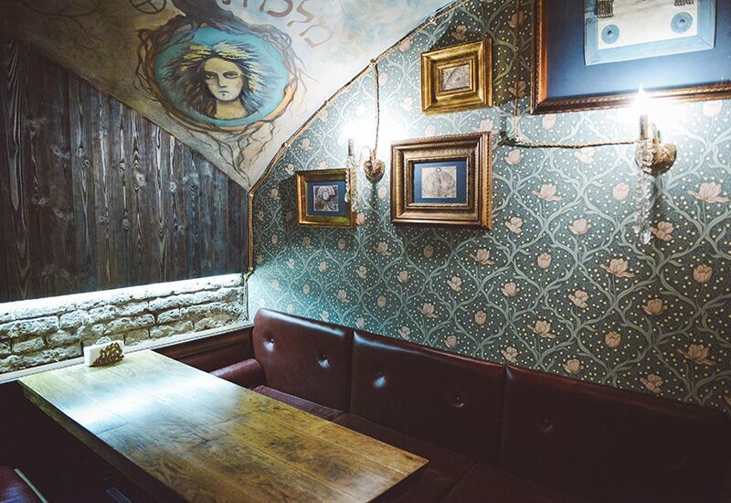 Из потолка над темной лестницей, по которой мы спускаемся в бар, густо прорастают корни деревьев. "Мы хотели добавить в подвал больше жизни, — рассказывает совладелец Mitzva bar Даниил Гольдман. — Еврейская культура во многом про семью, корни и традиции, поэтому деревья — важная часть интерьера бара. В зале с высокой посадкой корни также растут над стойкой, а на потолке нарисовано самое больше в Европе дерево жизни — это философская модель и кабалистическая схема мироздания".