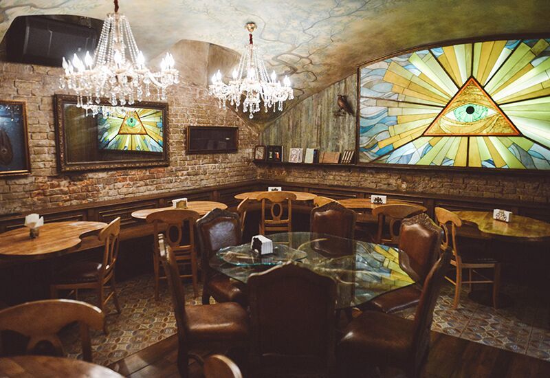 Первое, что в этом гротескном интерьере бросается в глаза любому гостю, — лучезарная дельта во всю стену. Она изготовлена в витражной мастерской по самой архаичной технологии, такие делали для католических соборов. Зал оформлен так, что здесь действительно можно проводить работы масонской ложи: все элементы — запон, священная книга, трибуна — размещены в правильном порядке.