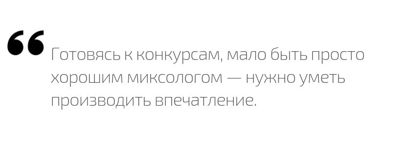 Конкурсы это не бонус к зарплате, а в первую очередь саморазвитие. Готовясь к конкурсам, а они очень серьезно изменились за последние десять лет, мало быть просто хорошим миксологом — нужно уметь производить впечатление.